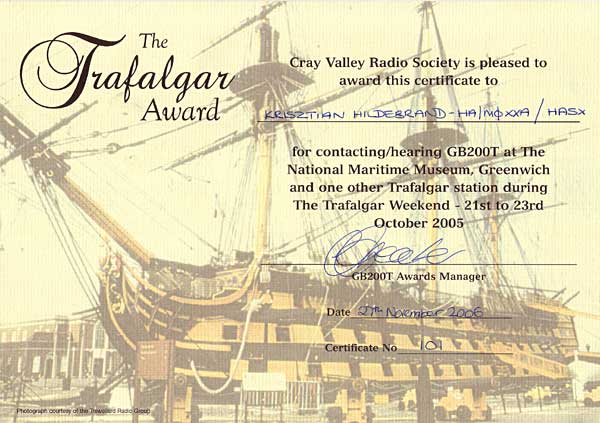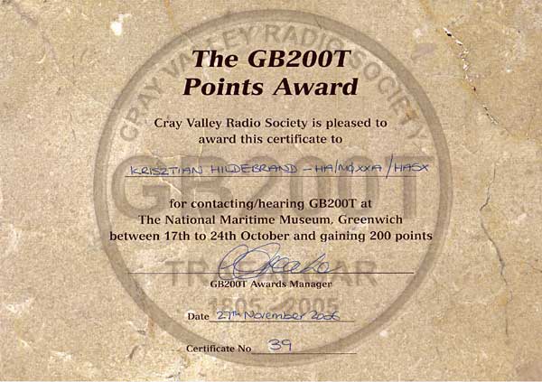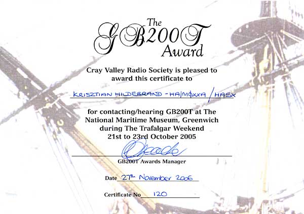 One of the most remarkable HAM activities of the past few years. GB200T was a special event station located at the National Maritime Museum. A lot of visitors could see and even operate the station. I had plenty of QSOs with GB200T and was also very happy to be able to talk to visitors just curious what amateur radio was all about. No wonder I am proud to hold all the three awards associated with this event.